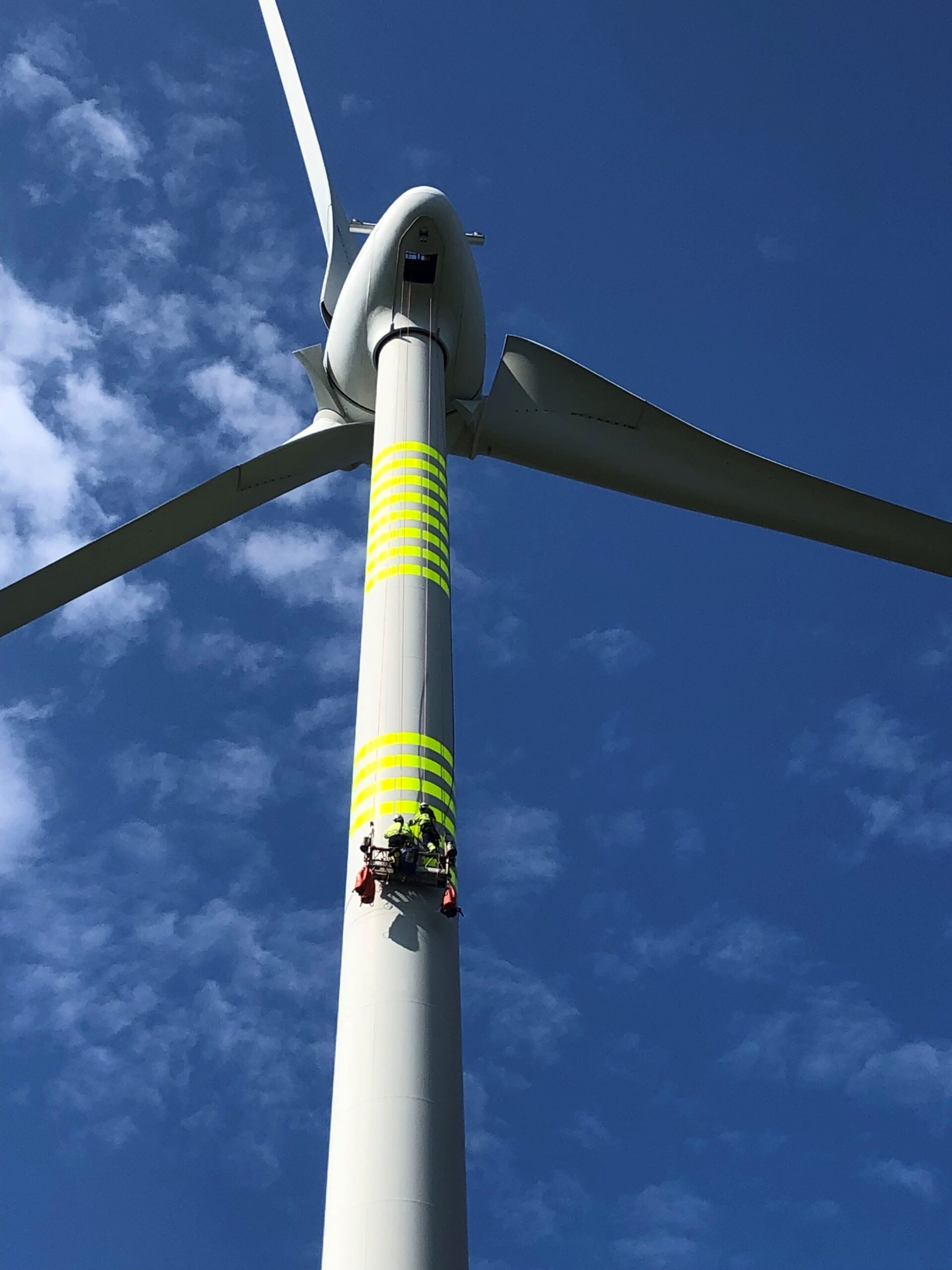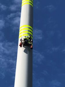 Vi leverer installasjon av reflekterende markeringsbånd på vindturbiner i henhold til krav fra Luftfartstilsynet for merking av luftfartshindre.